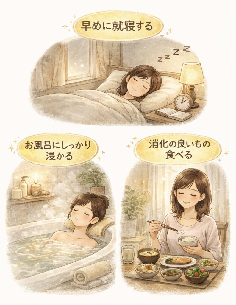 体の不調を感じてからは、「早めに休む」「温める」「消化に負担をかけない」など出来る対策を選んで実行してきました。
